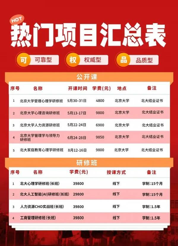 | 1 | 北大心理学研修班(长班) | 29800 | 1.5年 | 线下 | 北大结业证书 |